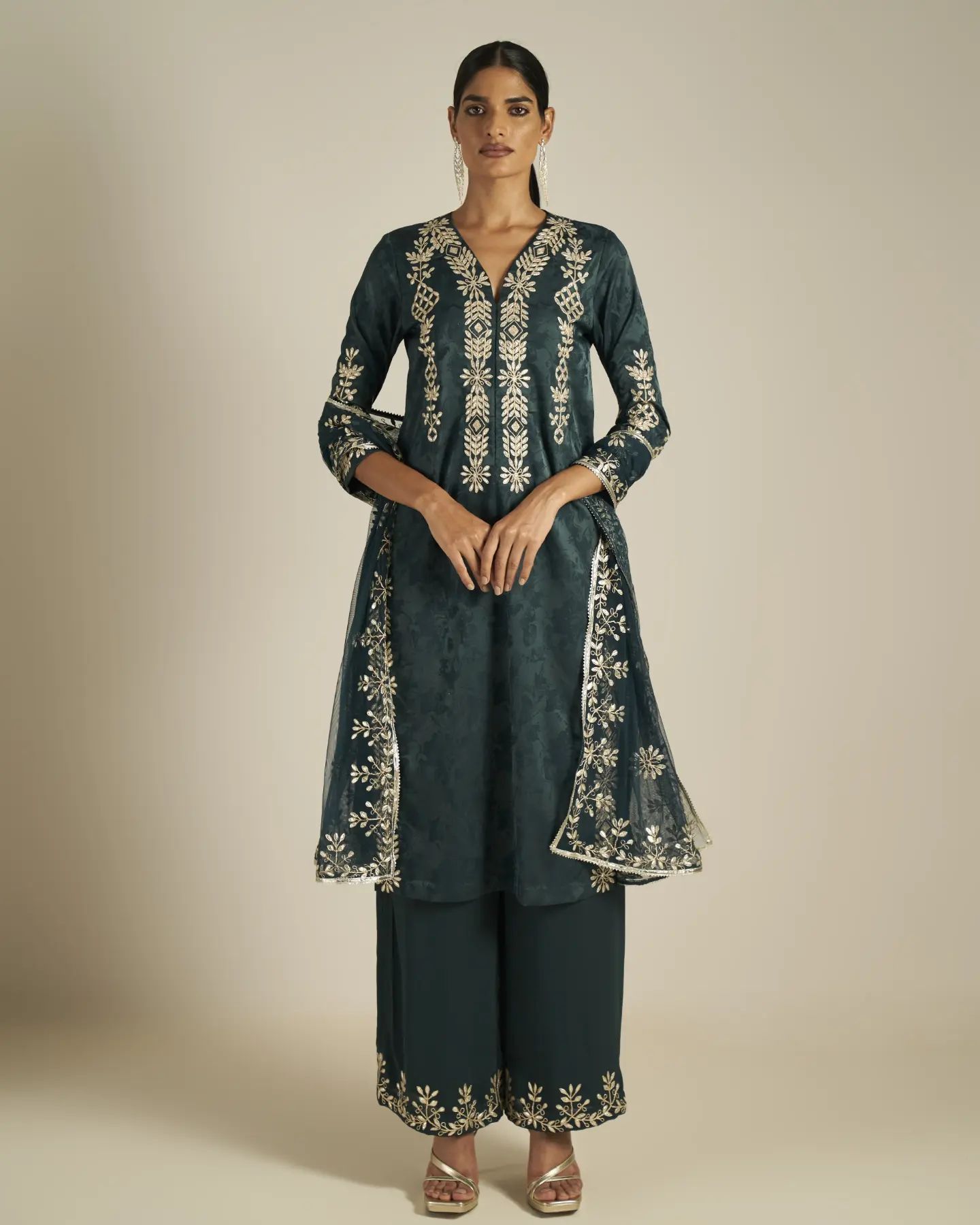 Featuring a dark green branded kurta set inspired by the lush palm tree shadows. The tunic is fashioned with a V-neckline and 3/4 sleeves and is made of luxurious jacquard. The outfit oozes exquisite sophistication because to its beautiful dori work, machine embroidery, and gotta patti. Completing the ensemble are a matching palazzo and dupatta. For more info visit: https://rannagill.co.in/collections/sets